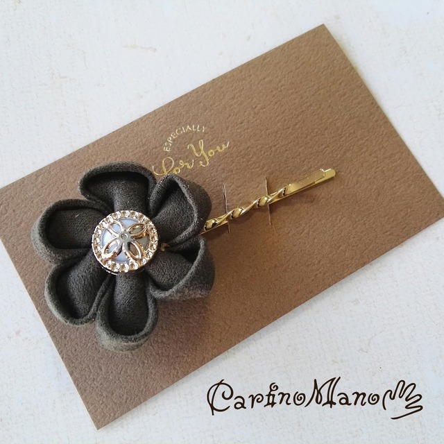 真ん中にビジューをあしらったお花のツイストヘアピンです。 お出かけの際のワンポイントに◎。色違い・種類違いもあります。 ヘアピンの部分がツイストになっているところがポイントです。