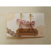 きらきらとしたラメ糸入りのレース糸で編んだシンプルなリボンの耳飾りです。中心にラインストーンがついています。金具はピアス(フック・ポスト)とイヤリング(樹脂ノンホール)から選べます。1個=【1ペア】となります。