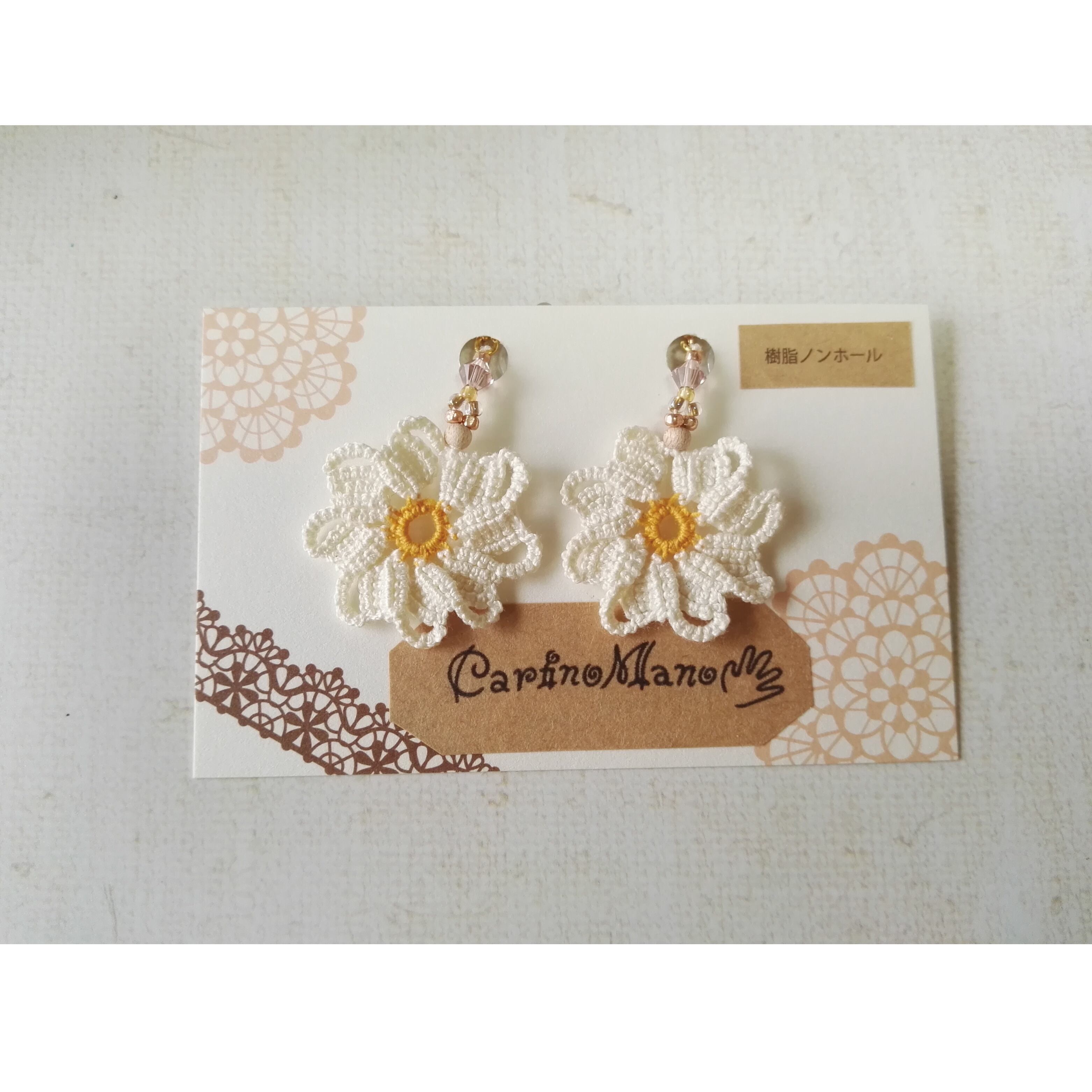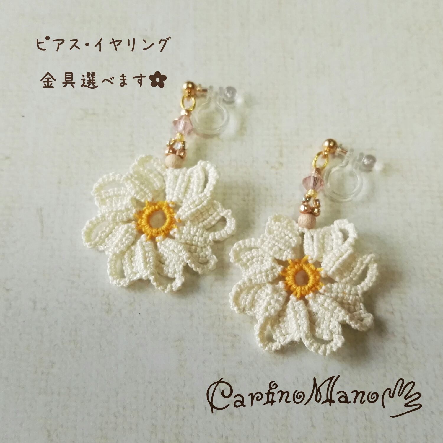 レース糸で編んだお花の耳飾りです。金具はピアス(フック・ポスト)とイヤリング(樹脂ノンホール)から選べます。1個=【1ペア】となります。
