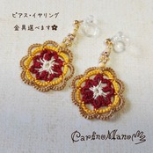 レース糸で編んだお花の耳飾りです。金具はピアス(フック・ポスト)とイヤリング(樹脂ノンホール)から選べます。1個=【1ペア】となります。
